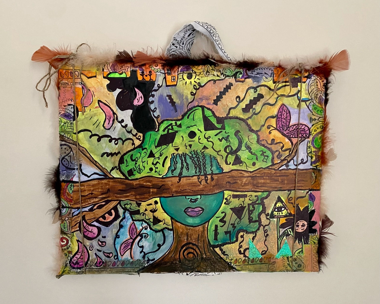 Acrylic paint, oil pastels & alcohol markers on recycled cardboard